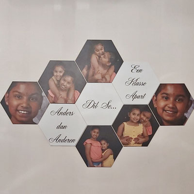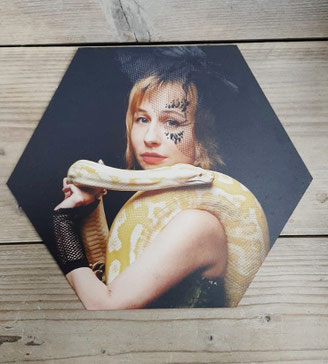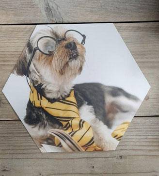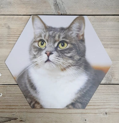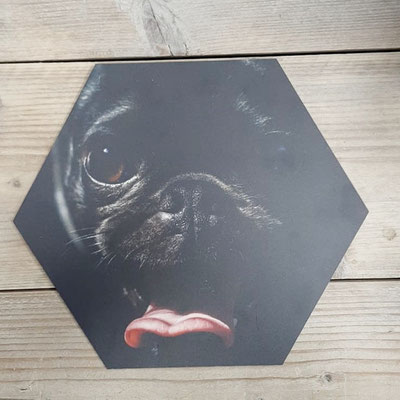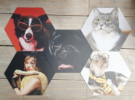 Zeshoekig PVC met daarop je eigen foto, print of patroon, logo of foto. We hebben ze 3 maten, 20cm, 30cm of 40 cm breed. We kunnen tegen een meer prijs ook een Hexagons snijden op Plexiglas, Wit Metaal of Hout.